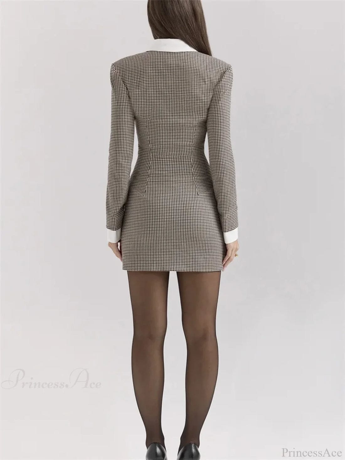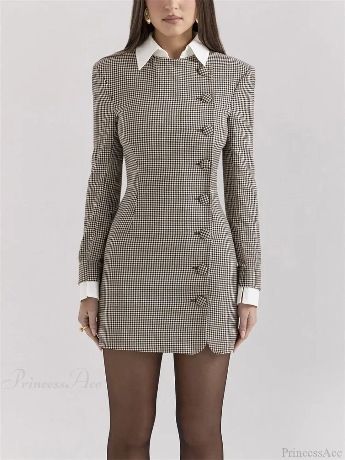 Dress bermotif houndstooth ini memancarkan pesona klasik yang sophisticated dengan sentuhan modern. Dirancang dengan potongan tailored yang pas di tubuh, dress ini menonjolkan siluet feminin yang rapi dan elegan. Detail kancing asimetris di bagian depan memberikan aksen unik sekaligus memperkuat kesan eksklusif.