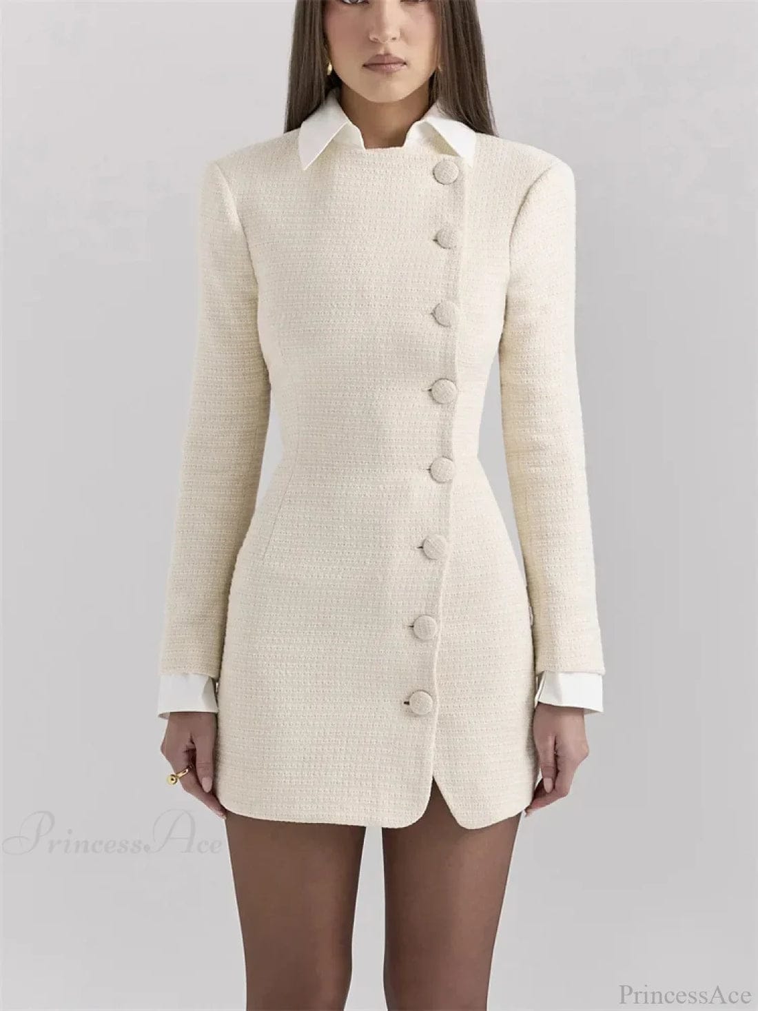 Kerah tinggi yang clean dan panjang mini menciptakan perpaduan antara formal dan chic, menjadikannya pilihan sempurna untuk tampilan urban yang berkelas. Mudah dipadukan dengan tights dan aksesori minimalis, dress ini cocok untuk aktivitas profesional ringan, acara semi-formal, maupun gaya city walk yang anggun.