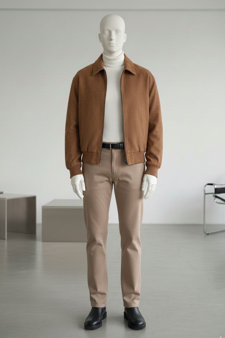 Jaket bernuansa tua ini memancarkan estetika minimalis modern. Dipadukan dengan atasan turtleneck terang dan celana bernada netral, tampilannya terasa seimbang dan elegan. Potongan lurus dengan kerah sederhana memberi kesan maskulin yang tenang dan sophisticated, cocok untuk gaya urban yang bersih dan kontemporer.